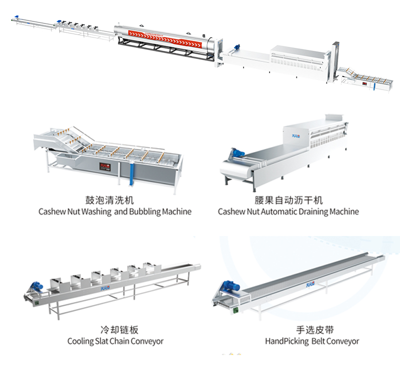 腰果隸屬于進口高檔堅果,生產工藝極其重要,天元星研發的腰果生產線精準把控了產品質量,產品從上料、清洗、瀝水、靜置、炒制、篩選、冷卻等實現了智能數字化控制,諸多新技術使產品質量穩定、產量高、用人少、成本低,生產過程行云流水,外型設計美觀大氣。